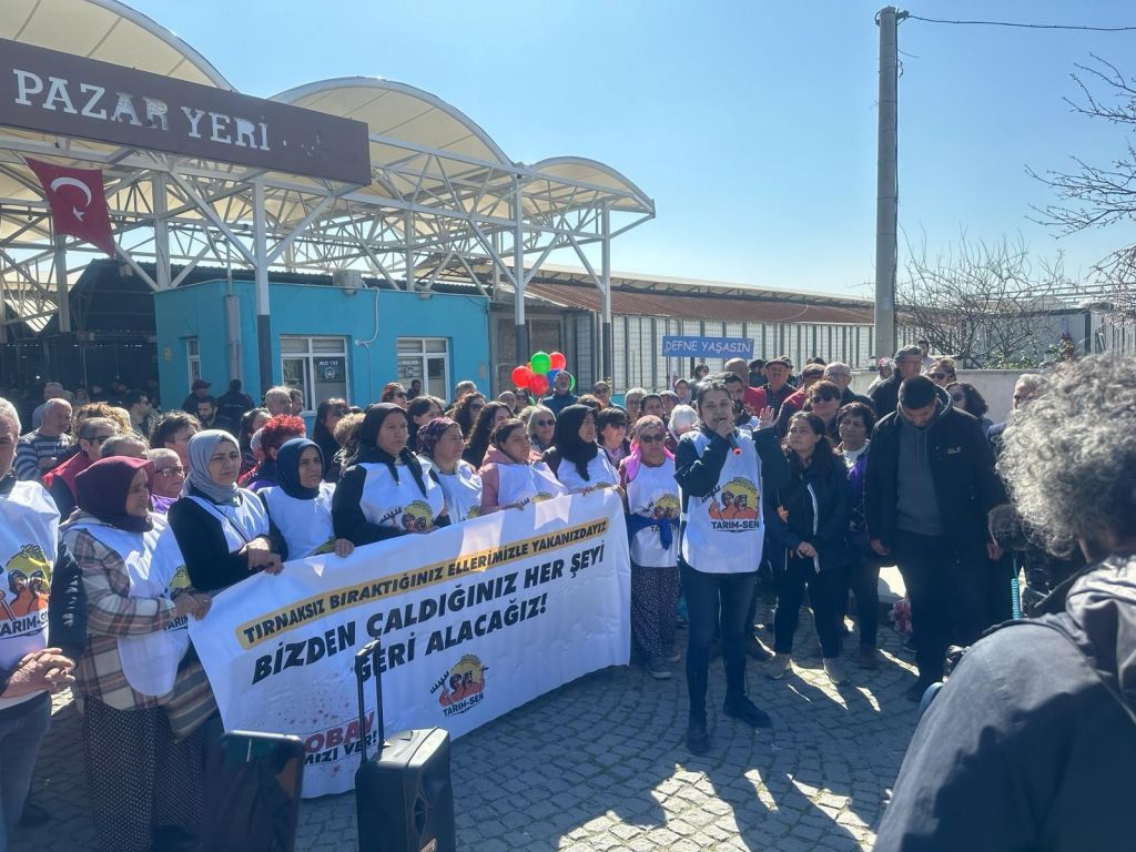 İzmir’in Bergama ilçesinde Agrobay Seracılık’ta çalışırken, Tarım İşçileri Sendikası’na (Tarım-Sen) üye oldukları gerekçesi ile işten atılan ve Ağustos 2023’den bu yana hakları için mücadele eden, çoğunluğu kadın işçilerden oluşan 37 Agrobay işçisinin 18 Mart tarihinde Bergama’dan Ankara’ya başlayan yürüyüşleri için yanlarındaydık.