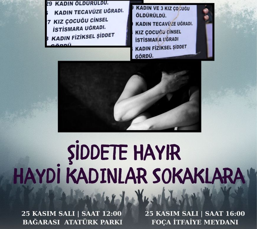 Her yıl olduğu gibi, bu yıl da 25 Kasım’da ”Kadına Yönelik Şiddete Karşı Uluslararası Mücadele Günü” dolayısı ile meydanlardaydık. ilkin, öğlen saatlerinde Bağarası Atatürk Parkı’nda bir araya geldik. Bağarası sokaklarından pankartlarımız, dövizlerimiz ve sloganlarımız eşliğinde yürüyerek meydana ulaştık ve basın bildirimizi okuduk. Aynı gün öğleden sonra, Foça Merkez’de İtfaiye Meydanı’nda toplanarak, yine sloganlarımız, pankart ve dövizlerimiz ile Nihat Dirim Demokrasi Meydanı’na yürüyerek, bildirimizi okuduk. 26 … Okumaya devam et 25 KASIM 2025
