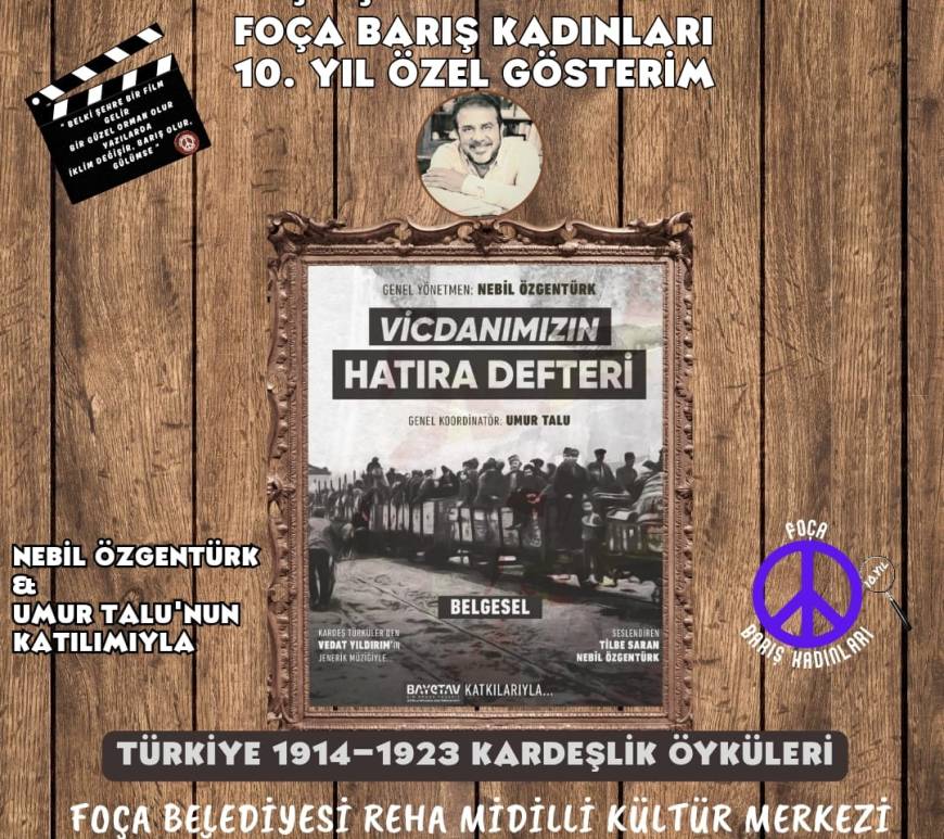 “VİCDANIMIZIN HATIRA DEFTERİ” BELGESEL GÖSTERİMİ 1 Eylül Dünya barış Gününde Foça Barış Kadınları kuruluşunun 10.yılını yönetmenliğini Nebil Özgentürk genel koordinatörlüğünü Umur Talu’nun yaptığı ” Vicdanımızın Hatıra Defteri” ile kutladı. Foça Belediye Başkanı Saniye Bora Fıçı’nın da katıldığı etkinlikte belgesel gösteriminden sonra Nebil Özgentürk ve Umur Talu belgeselin hikayesine ve yapım sürecine ilişkin söyleşi gerçekleştirdi. Foçalıların yoğun ilgi gösterdiği programda , trajedinin, yıkımın, göç ve sürgünün … Okumaya devam et 1 EYLÜL DÜNYA BARIŞ GÜNÜ